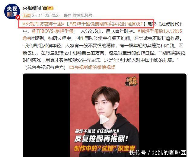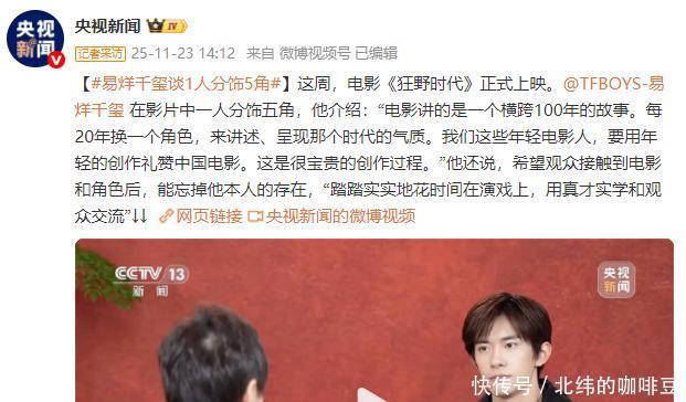 资料参考: 央视新闻|#央视专访易烊千玺##易烊千玺说要踏踏实实花时间演戏# 央视新闻|#易烊千玺谈1人分饰5角# 央视网文娱